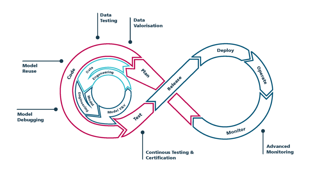 MLOps builds upon the idea of DevOps. It is mainly about automation and requires a solid foundation based on mature tools and methods and builds upon interoperability and communication on several levels (technical, semantically, organizational).