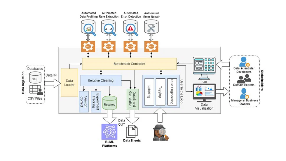The process begins with data ingestion from various sources, including SQL databases and CSV files, managed by a data loader that feeds into a dashboard controller. The modular design allows integration with external tools via standard REST APIs. An automated data profiling module analyzes and records the data’s characteristics, while an automated rule extraction module generates rules based on statistical properties and domain-specific features. These rules guide the automated error detection module, which scans for inconsistencies and outliers, and the automated error repair module, which applies advanced algorithms to correct detected errors, minimizing the need for manual intervention. A version control tracking module records each data version, enabling robust data management and facilitating rollbacks if necessary. The system also generates DataSheets capturing critical information such as data version tags, hyperparameters, generated rules, data quality metrics, and utilized cleaning tools.