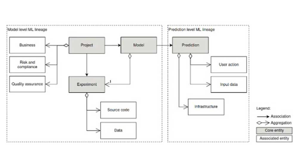 ML lineage fundamentally distinguishes between the model and prediction levels, conceptually encompassing separate yet interconnected core domains for the project, experiment, model, and prediction. ML lineage easily integrates with existing MLOps pipelines, workflows, and tools, often requiring minimal additional effort, such as generating model cards or integrating with existing pipelines.