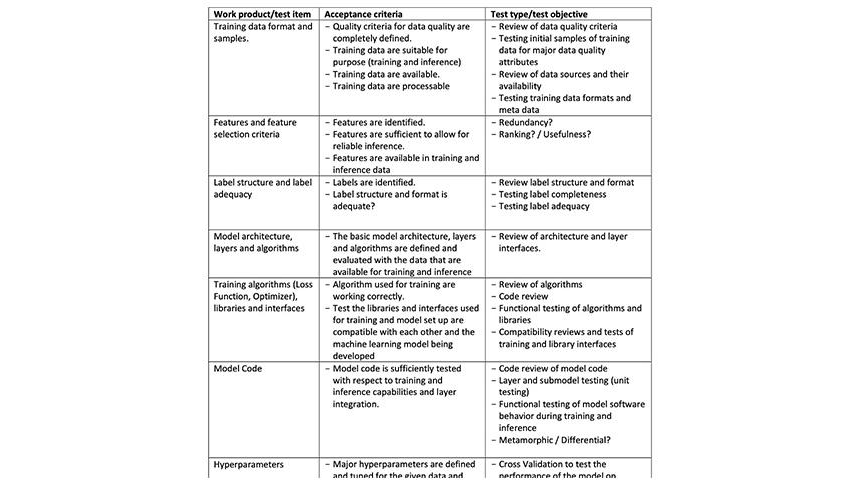 Besides the major outcomes of each phase, the methodology identifies additional test items that each contributes to the quality of the overall system. Each phase includes specific testing activities, such as data, model and component testing referring to different test methods and kinds of testing such as dynamic and static testing, monitoring, and reviews, to ensure that at the end the system meets the defined criteria and maintains its quality throughout its lifecycle.